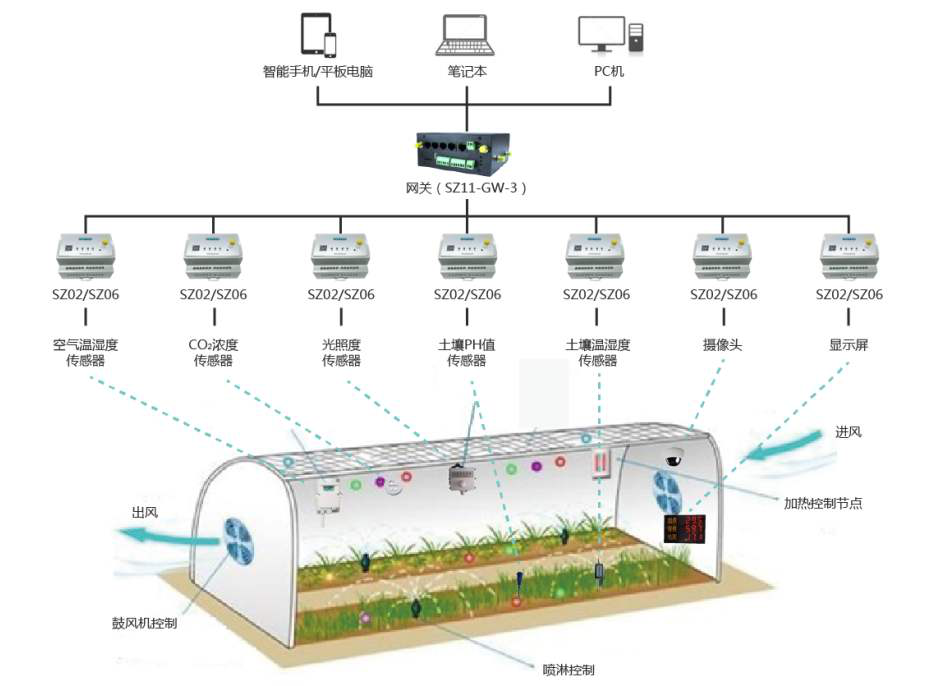 以生態(tài)溫室為例,隨著遠(yuǎn)程監(jiān)控系統(tǒng)、無線傳感器監(jiān)測(cè)等技術(shù)日趨成熟,物聯(lián)網(wǎng)、大數(shù)據(jù)等技術(shù)已逐步應(yīng)用到了生態(tài)農(nóng)業(yè)建設(shè)中。通過環(huán)境、動(dòng)植物信息檢測(cè),溫室農(nóng)業(yè)大棚信息檢測(cè)和標(biāo)準(zhǔn)化生產(chǎn)監(jiān)控,精準(zhǔn)農(nóng)業(yè)中的節(jié)水灌溉等應(yīng)用模式,提高了農(nóng)業(yè)生產(chǎn)的管理效率、提升了農(nóng)產(chǎn)品的附加值、加快了智慧農(nóng)業(yè)的建設(shè)步伐。其主要方式通過安裝于指定的監(jiān)測(cè)點(diǎn)的空氣溫濕度傳感器、土壤溫濕度傳感器、土壤PH傳感器、光合有效輻射傳感器、CO2傳感器等設(shè)備實(shí)時(shí)監(jiān)測(cè)空氣的溫濕度、二氧化碳濃度、土壤溫濕度及PH值等相關(guān)數(shù)據(jù);聯(lián)動(dòng)控制系統(tǒng)由加熱、噴灌、通風(fēng)、卷簾設(shè)備及其配套PLC及Wifi設(shè)備服務(wù)器組成,當(dāng)傳感器采集的環(huán)境數(shù)據(jù)與標(biāo)準(zhǔn)值對(duì)比超出臨界范圍時(shí),控制器自動(dòng)啟動(dòng)相關(guān)硬件設(shè)備對(duì)作物生長環(huán)境加熱、澆水、通風(fēng)、卷簾加減光照輻射,實(shí)現(xiàn)作物生長過程精確控制。同時(shí)在塑膜日光溫室旁,建立地下沼氣池,沼氣池上方建圈舍及廁所,形成一個(gè)封閉的智慧化能源生態(tài)系統(tǒng)。在此系統(tǒng)內(nèi),圈舍溫度在冬天提高3~5℃,為禽畜提供了更適宜的生長條件,使豬的生長期大幅縮短約150天。禽畜糞便為沼氣池提供原料,產(chǎn)出的沼氣用于家庭供暖,殘留的沼渣、沼液作為溫室作物的肥料。此外,豬等禽畜呼吸排出的CO2可促進(jìn)溫室內(nèi)作物光合作用,蔬菜產(chǎn)量和質(zhì)量明顯提高。