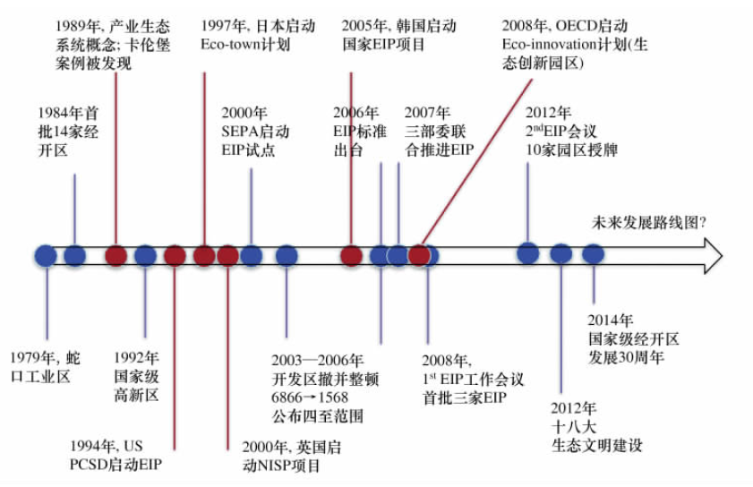 生態(tài)工業(yè)園區(qū)是產(chǎn)業(yè)生態(tài)學(xué)研究和實(shí)踐的重要載體之一。工業(yè)園區(qū)這一人工經(jīng)濟(jì)系統(tǒng)在發(fā)展中有意識(shí)地模仿自然生態(tài)系統(tǒng),應(yīng)用系統(tǒng)工程的理論和方法,對(duì)現(xiàn)有園區(qū)進(jìn)行重新規(guī)劃、設(shè)計(jì)和建設(shè),以提高資源、能源利用效率,減少污染物產(chǎn)生和排放,改善環(huán)境質(zhì)量,促進(jìn)經(jīng)濟(jì)持續(xù)發(fā)展。2000年以來,歐美國家、澳大利亞、日本、韓國、新加坡、印度、巴西等國家都出現(xiàn)了一系列關(guān)于生態(tài)工業(yè)園區(qū)案例的實(shí)證分析。工業(yè)發(fā)達(dá)國家生態(tài)工業(yè)園區(qū)發(fā)展的代表性例子包括丹麥、美國、英國、日本和韓國,下圖為幾個(gè)主要國家及中國推進(jìn)生態(tài)工業(yè)園區(qū)發(fā)展的演變概覽。發(fā)達(dá)國家現(xiàn)階段關(guān)于生態(tài)工業(yè)園區(qū)發(fā)展的重點(diǎn)問題主要集中在以下方面:(1)生態(tài)化發(fā)展的驅(qū)動(dòng)力,包括園區(qū)建立物質(zhì)、能量、信息、廢棄物等集成系統(tǒng)過程中潛在干系方之間建立合作聯(lián)系的驅(qū)動(dòng)力;(2)生態(tài)化發(fā)展準(zhǔn)則,目的是定義并識(shí)別推動(dòng)生態(tài)化發(fā)展的創(chuàng)新行動(dòng)(3)生態(tài)化發(fā)展成功要素,目的是從政治、經(jīng)濟(jì)、社會(huì)和環(huán)境識(shí)別各園區(qū)生態(tài)創(chuàng)新的成功要素;(4)定義針對(duì)推動(dòng)園區(qū)生態(tài)創(chuàng)新有效發(fā)展和管理的關(guān)鍵問題。