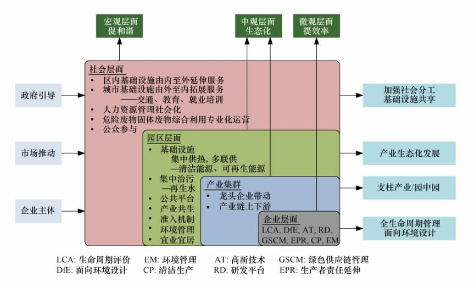 我國實(shí)施可持續(xù)發(fā)展戰(zhàn)略要求發(fā)展生態(tài)工業(yè),打破“綠色壁壘”也需要工業(yè)的生態(tài)化發(fā)展,可以說,生態(tài)工業(yè)是我國工業(yè)發(fā)展的必然選擇。生態(tài)工業(yè)理念被引入中國后,原國家環(huán)??偩钟?000年開始推動(dòng)生態(tài)工業(yè)園區(qū)建設(shè),發(fā)展過程中逐步形成了“有標(biāo)準(zhǔn)可依,依標(biāo)準(zhǔn)建設(shè),據(jù)標(biāo)準(zhǔn)考核,示范試點(diǎn)帶動(dòng),建立長效機(jī)制”的發(fā)展路線圖。鑒于開發(fā)區(qū)面臨的嚴(yán)峻環(huán)境保護(hù)形勢(shì),國家稅收政策調(diào)整、資源和能源緊缺、環(huán)保標(biāo)準(zhǔn)提高等伴隨的發(fā)展壓力,以及節(jié)能減排科技需求,2007年環(huán)保部、商務(wù)部、科技部聯(lián)合,加強(qiáng)對(duì)國家生態(tài)工業(yè)示范園區(qū)建設(shè)的推進(jìn)。生態(tài)工業(yè)示范園區(qū)是依據(jù)清潔生產(chǎn)要求、循環(huán)經(jīng)濟(jì)理念和工業(yè)生態(tài)學(xué)原理而設(shè)計(jì)建立的一種新型工業(yè)園區(qū)。它通過物流或能流傳遞等方式把不同工廠或企業(yè)連接起來,形成共享資源和互換副產(chǎn)品的產(chǎn)業(yè)共生組合,使一家工廠的廢棄物或副產(chǎn)品成為另一家工廠的原料或能源,模擬自然系統(tǒng),在產(chǎn)業(yè)系統(tǒng)中建立“生產(chǎn)者—消費(fèi)者—分解者”的循環(huán)途徑,尋求物質(zhì)閉環(huán)循環(huán)、能量多級(jí)利用和廢物產(chǎn)生最小化。