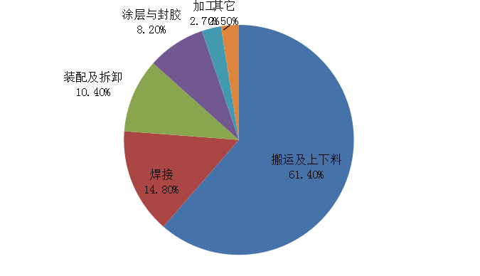 在國產(chǎn)工業(yè)機器人市場中,搬運及上下料銷量同比增長40.8%,占比達61.4%;焊接銷量同比增長9.7%,占比達14.8%;裝配及拆卸銷量同比增長5.4%,占比達10.4%。