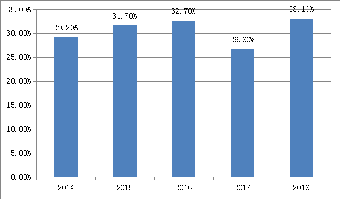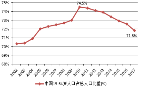 近年來,中國人口結(jié)構(gòu)發(fā)生了巨大變化,15-64歲勞動適齡人口占總?cè)丝诘谋戎刈?011年以來呈現(xiàn)逐步下滑的趨勢,2017年該比重已經(jīng)下滑至71.8%,相比2010年的最高點降低了2.7個百分點。另外,中國社會的老齡化問題更加嚴重,中國人口紅利逐步消失,目前已經(jīng)出現(xiàn)了劉易斯拐點。人口結(jié)構(gòu)的變化,勞動力供給條件的變化顯著的推高了我國的勞動成本,不僅削弱了制造業(yè)的競爭力,對勞動密集型的產(chǎn)業(yè)同樣也帶來了嚴峻的挑戰(zhàn),也削弱了中國產(chǎn)品在全球市場的競爭力。