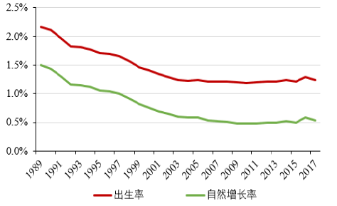 另一方面,中國近年來的人口出生率和自然增長率也呈現(xiàn)不斷下降的趨勢,2017年比2016年出生人口減少了63萬人,人口出生率僅為12.4‰,同比降低0.5‰,這一數(shù)據(jù)比日本的出生率還要低。我國的人口自然增長率更是下降到5.3‰,長期的低生育水平直接加大了對未來我國勞動力不足的擔(dān)憂。