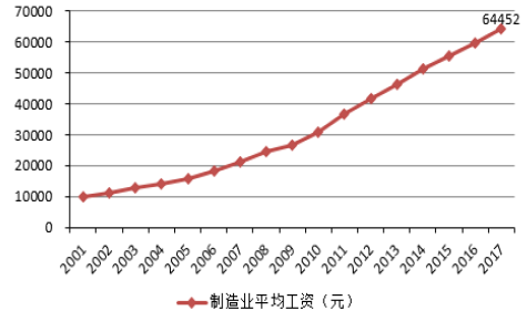 除了未來勞動力不足之外,中國制造業(yè)員工的平均工資則呈現(xiàn)逐年增長的態(tài)勢,2017年已升至64452元,同比增長8.4%。勞動力成本不斷上升,用機器人代替人工也是更加經(jīng)濟、符合市場規(guī)律的必然選擇。目前,“世界工廠”正不斷的從中國向東南亞等其他國家和地區(qū)轉(zhuǎn)移,中國改革開放初期借助人口紅利快速發(fā)展的條件已然不復(fù)存在。解決勞動力不足、勞動力成本上升的主要途徑就是智能制造,即生產(chǎn)過程的自動化、智能化產(chǎn)業(yè)升級。未來通過產(chǎn)業(yè)的轉(zhuǎn)型升級更加注重質(zhì)量和效益的提升,“機器代人”的生產(chǎn)方式將會更加普遍。