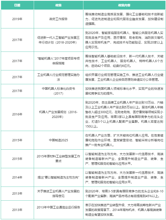 智能制造是“中國制造2025”發(fā)展規(guī)劃的重要發(fā)展方向,是未來制造業(yè)發(fā)展的必然趨勢,工業(yè)機器人是智能制造的關(guān)鍵設(shè)備,行業(yè)發(fā)展?jié)摿薮?。近年來,國家出臺了一系列的政策支持和鼓勵中國工業(yè)機器人行業(yè)的發(fā)展。根據(jù)2016年國務(wù)院發(fā)布的《機器人產(chǎn)業(yè)發(fā)展規(guī)劃(2016-2020年)》,到2020年,我國工業(yè)機器人產(chǎn)量達到10萬臺,六軸及以上工業(yè)機器人年產(chǎn)量達到5萬臺以上;培育3家以上具有國際競爭力的龍頭企業(yè);機器人密度達到150以上。