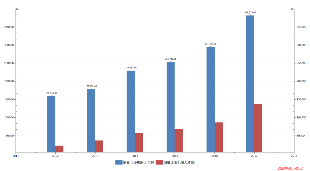中國自2013年起成為了全球工業(yè)機器人最大的市場,2017年,中國工業(yè)機器人銷量達14.1萬臺,同比增長62.1%,全球工業(yè)機器人銷量為38萬臺,中國占全球的比重高達37%。中國工業(yè)機器人銷量不僅總量較大,而且增速也比較快,2011-2017年銷量年均增速高達39.5%。