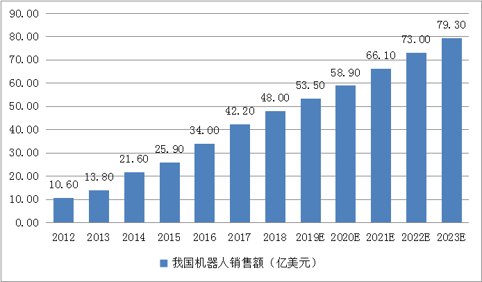 2018年,我國工業(yè)機器人銷售額達48億美元,同比增長24.1%。未來隨著生產(chǎn)方式向柔性、智能、精細轉(zhuǎn)變,對工業(yè)機器人的需求將呈現(xiàn)大幅增長。根據(jù)前瞻產(chǎn)業(yè)研究院的預(yù)測,到2023年,國內(nèi)市場規(guī)模將翻一番,進一步擴大到79.3億美元。