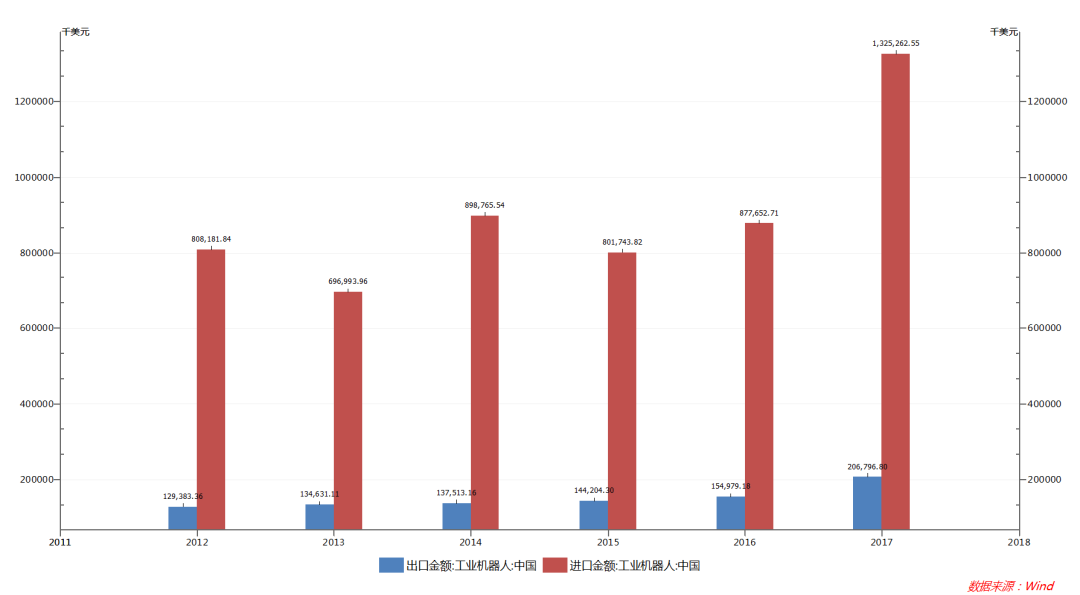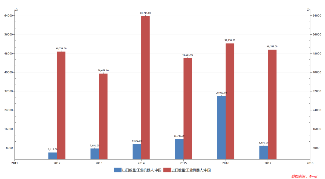 中國工業(yè)機器人進出口數(shù)量(臺)