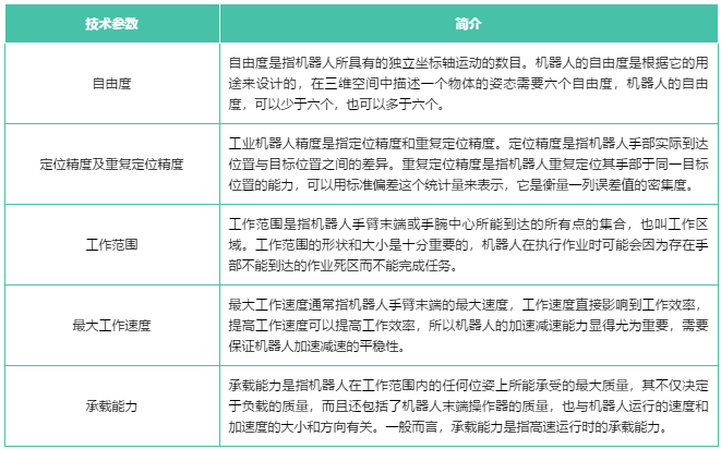 工業(yè)機器人的主要技術(shù)參數(shù)一般有自由度、定位精度及重復(fù)定位精度、工作范圍、最大工作速度和承載能力等。這些參數(shù)是工業(yè)機器人本體制造過程中重要的考量指標(biāo),是衡量一家廠商本體制造水平高低的標(biāo)準(zhǔn)。