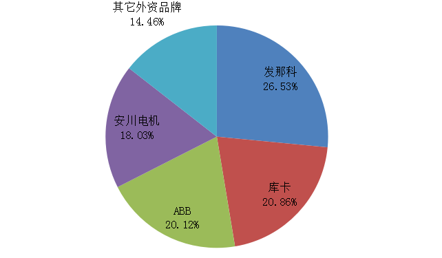 2017年,四大家族在中國工業(yè)機器人市場上的市場份額高達57.4%,發(fā)那科占比最高,達17.8%,其次為庫卡14.0%,ABB13.5%,安川電機12.1%,而其他外資品牌僅占9.7%。2017年四大家族在中國的市占率進一步加大,國產(chǎn)機器人品牌面臨較大壓力。