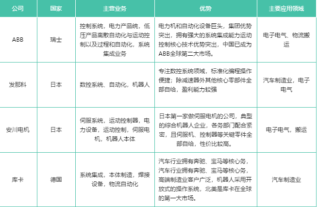 在世界工業(yè)機器人行業(yè)中,以瑞士的ABB、德國的庫卡、日本的發(fā)那科和安川電機最為著名,并稱為工業(yè)機器人“四大家族”。它們在亞洲市場上同樣有著舉足輕重的地位,在中國工業(yè)機器人市場上占據(jù)大半江山,幾乎壟斷了機器人本體制造、焊接等高端領(lǐng)域。