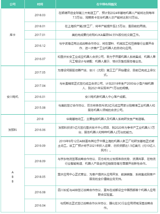 近年來,四大家族不斷加大在中國的業(yè)務(wù)布局,持續(xù)擴張產(chǎn)能并且將發(fā)展重點瞄準(zhǔn)了中國市場。一方面,是出于高端行業(yè)的未來發(fā)展前景較好,四大家族對機器人行業(yè)景氣度的信心充足。另一方面,中國作為全球機器人最大需求市場,其地位日益重要,未來成長空間較大。
