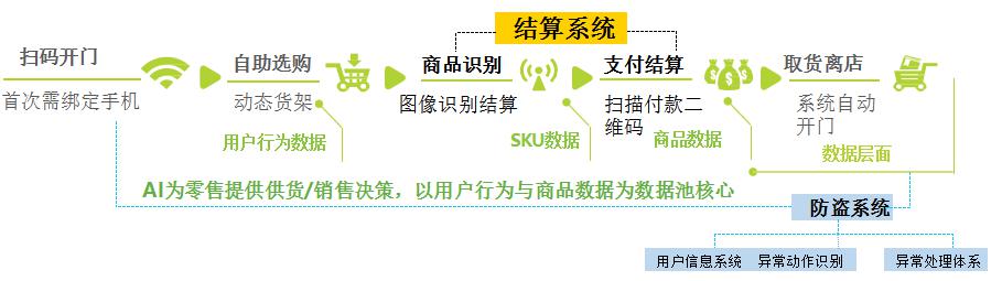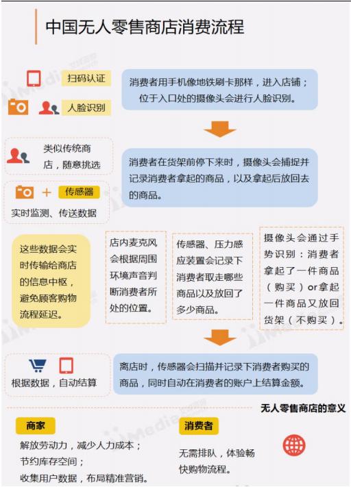 國內(nèi)目前的無人零售店的消費(fèi)流程主要分為:掃碼認(rèn)證或人臉識(shí)別、挑選商品、根據(jù)數(shù)據(jù)自動(dòng)結(jié)算這些環(huán)節(jié)。對(duì)于商家而言,可以節(jié)約人力成本和沉淀消費(fèi)數(shù)據(jù),對(duì)于消費(fèi)者而言,則可以增強(qiáng)體驗(yàn)感和減少排隊(duì)時(shí)間。