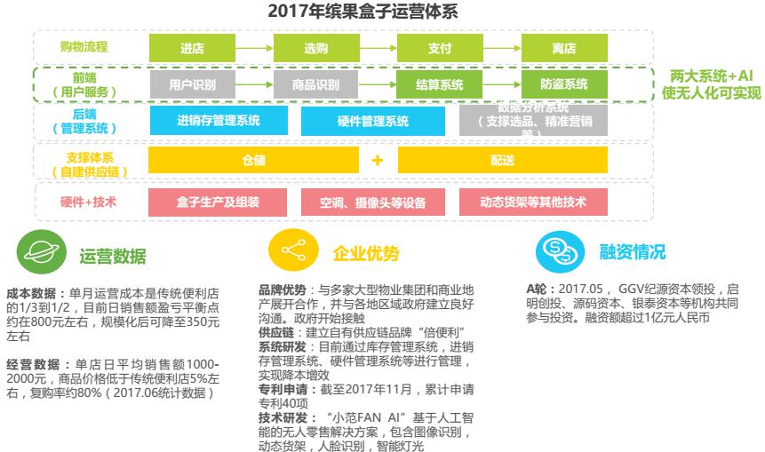 ? 無人開放式貨架,主要設(shè)置在辦公空間,消費(fèi)者自取商品并通貨架上二維碼支付,典型代表包括猩便利、零食e家、用點(diǎn)心吧等。相比于自動(dòng)售貨機(jī),開放貨架成本低(自動(dòng)售貨機(jī)單機(jī)成本2~2.5萬、放開貨架成本100~300元),一般無入駐租金,缺點(diǎn)是丟失率難控制。例如猩便利每個(gè)貨架可以放置 40多個(gè)SKU、300件商品,最高可達(dá)每日補(bǔ)貨,已經(jīng)入駐強(qiáng)生、中國平安、美團(tuán)點(diǎn)評(píng)、優(yōu)客工場、分期樂等企業(yè);