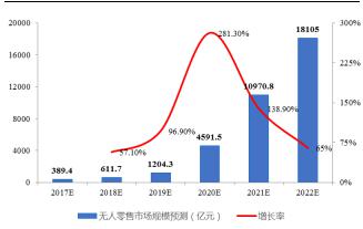 據(jù)艾媒咨詢預(yù)測,2017年我國無人零售商店交易額預(yù)計(jì)為389.4 億元,未來五年無人零售商店將會(huì)迎來發(fā)展紅利期,2020年的預(yù)計(jì)增長率可達(dá)281.3%,至2022年市場交易規(guī)模將超過1.8萬億元。同時(shí),艾媒咨詢預(yù)計(jì),2017年我國無人零售商店的用戶規(guī)模僅為600萬人,未來五年用戶規(guī)模將大幅增長,至2022年可達(dá)2.45億人。