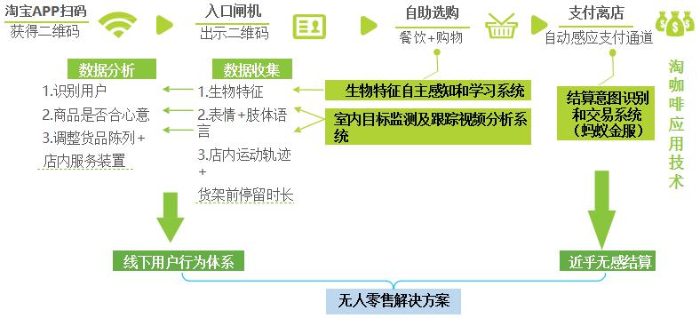 2017年7月阿里巴巴在淘寶造物節(jié)上推出無人便利店淘咖啡。淘咖啡經(jīng)營面積約200平米,分成超市區(qū)(無店員)和餐飲點(diǎn)單區(qū)(有少量店員),可一次性容納客流50人左右。消費(fèi)者通過手機(jī)淘寶 APP 掃碼進(jìn)店,選購?fù)瓿珊笮柰ㄟ^兩道結(jié)算門,當(dāng)?shù)谝坏篱T感應(yīng)到消費(fèi)者的離店需求時(shí)即會(huì)開啟,消費(fèi)者走出第一道門后,系統(tǒng)會(huì)自動(dòng)對(duì)所購買商品進(jìn)行識(shí)別與結(jié)算,結(jié)算完成后第二道門自動(dòng)打開,消費(fèi)者離店。
