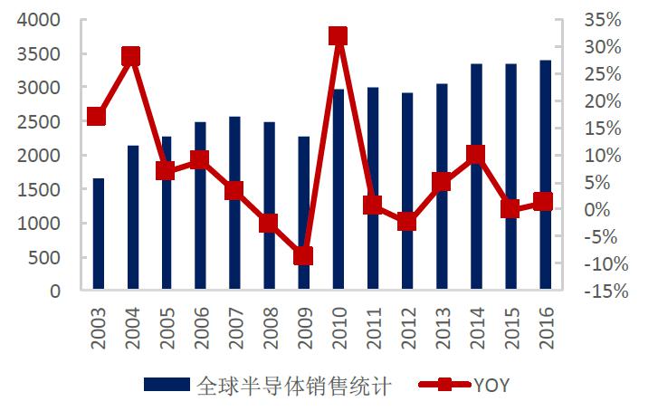 隨著全球經(jīng)濟(jì)的逐步復(fù)蘇,PC、手機(jī)、液晶電視等消費類電子產(chǎn)品需求不斷增加,同時在以物聯(lián)網(wǎng)、可穿戴設(shè)備、云計算、大數(shù)據(jù)、新能源、醫(yī)療電子和安防電子等為主的新興應(yīng)用領(lǐng)域強(qiáng)勁需求的帶動下,半導(dǎo)體銷售市場規(guī)模穩(wěn)定增長,預(yù)計2017年全球集成電路市場規(guī)模增長至3465億美元。