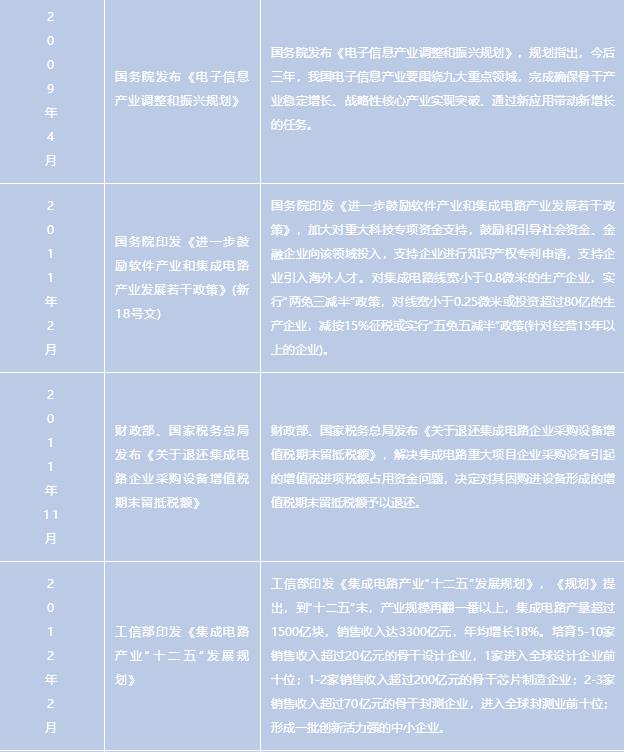 2011年出臺的《國務(wù)院關(guān)于印發(fā)進(jìn)一步鼓勵軟件產(chǎn)業(yè)和集成電路產(chǎn)業(yè)發(fā)展若干政策的通知》,提出要大力支持軟件和集成電路重大關(guān)鍵技術(shù)的研發(fā),努力實現(xiàn)關(guān)鍵技術(shù)的整體突破,加快具有自主知識產(chǎn)權(quán)技術(shù)的產(chǎn)業(yè)化和推廣應(yīng)用,重點支持高端芯片、集成電路裝備和工藝技術(shù)、集成電路關(guān)鍵材料、關(guān)鍵應(yīng)用系統(tǒng)的研發(fā)以及重要技術(shù)標(biāo)準(zhǔn)的制訂;在《電子信息制造業(yè)“十二五”發(fā)展規(guī)劃》和《集成電路產(chǎn)業(yè)“十二五”發(fā)展規(guī)劃》中也均提出要著力發(fā)展芯片設(shè)計業(yè),壯大芯片制造業(yè),開發(fā)髙性能集成電路產(chǎn)品,增強(qiáng)先進(jìn)和特色工藝能力。