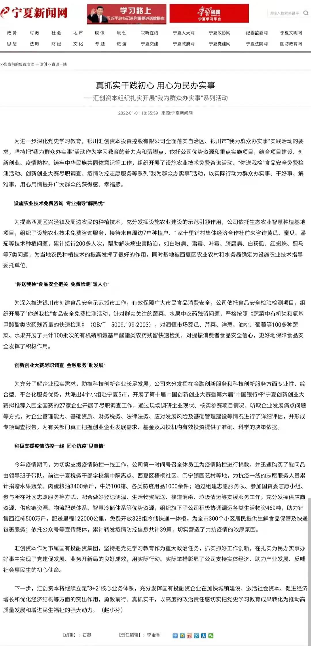 為進(jìn)一步深化黨史學(xué)習(xí)教育,匯創(chuàng)資本全面落實(shí)自治區(qū)、銀川市“我為群眾辦實(shí)事”實(shí)踐活動(dòng)的要求,堅(jiān)持把“我為群眾辦實(shí)事”活動(dòng)作為學(xué)習(xí)教育的著力點(diǎn)和落腳點(diǎn),依托公司優(yōu)勢(shì)資源和重點(diǎn)實(shí)施項(xiàng)目,結(jié)合項(xiàng)目建設(shè)、創(chuàng)新創(chuàng)業(yè)、疫情防控、鑄牢中華民族共同體意識(shí)等工作,組織開(kāi)展了設(shè)施農(nóng)業(yè)技術(shù)免費(fèi)咨詢活動(dòng)、“你送我檢”食品安全免費(fèi)檢測(cè)活動(dòng)、創(chuàng)新創(chuàng)業(yè)大賽盡職調(diào)查、疫情防控志愿服務(wù)等系列“我為群眾辦實(shí)事”活動(dòng),以實(shí)際行動(dòng)為群眾辦實(shí)事、干好事、解難事,用心用情提升廣大群眾的獲得感、幸福感,獲得了寧夏新聞網(wǎng)宣傳報(bào)道。
